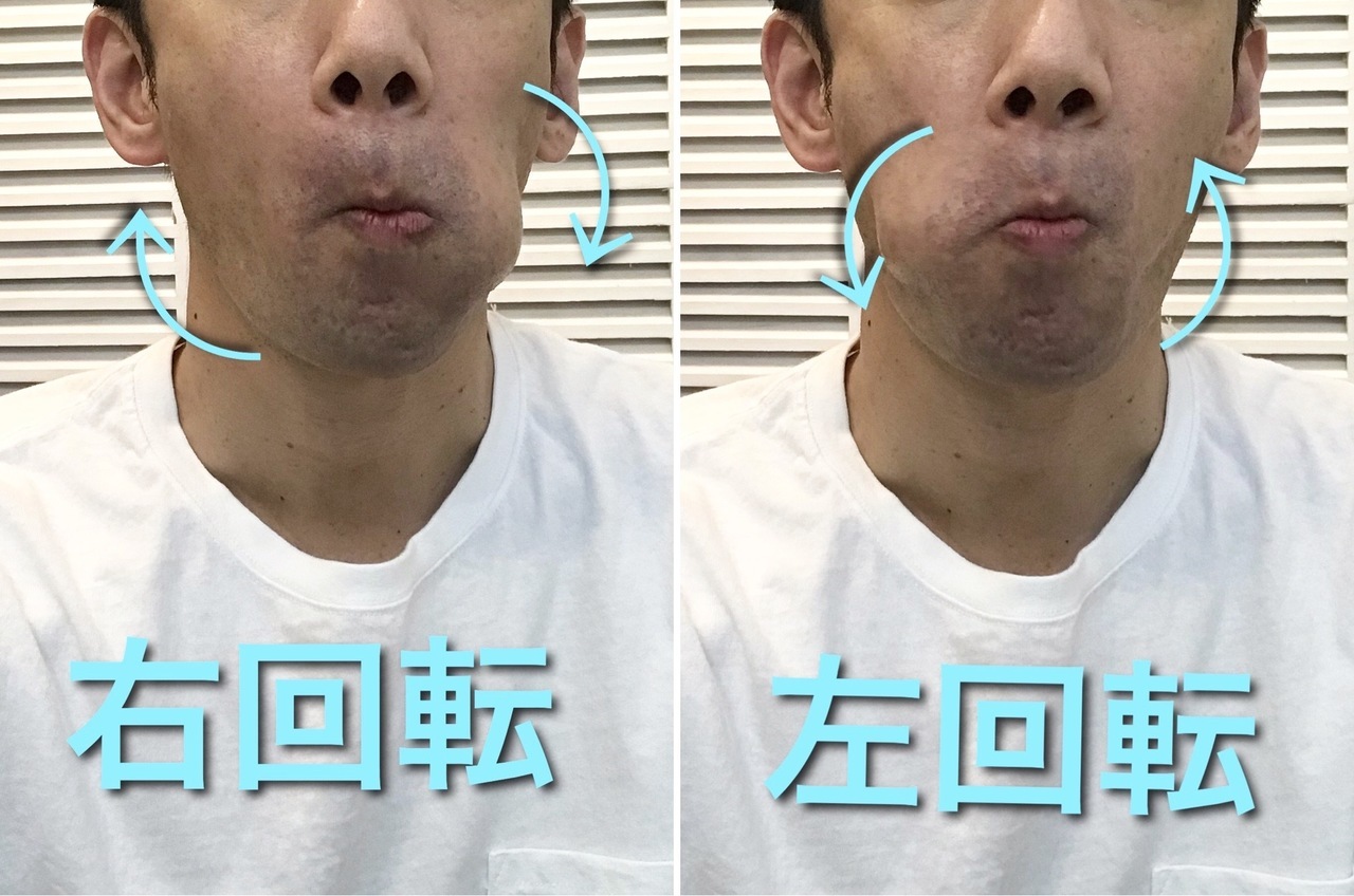舌先を前歯の前を通し頬の方まで行ったら一周するように回してください。